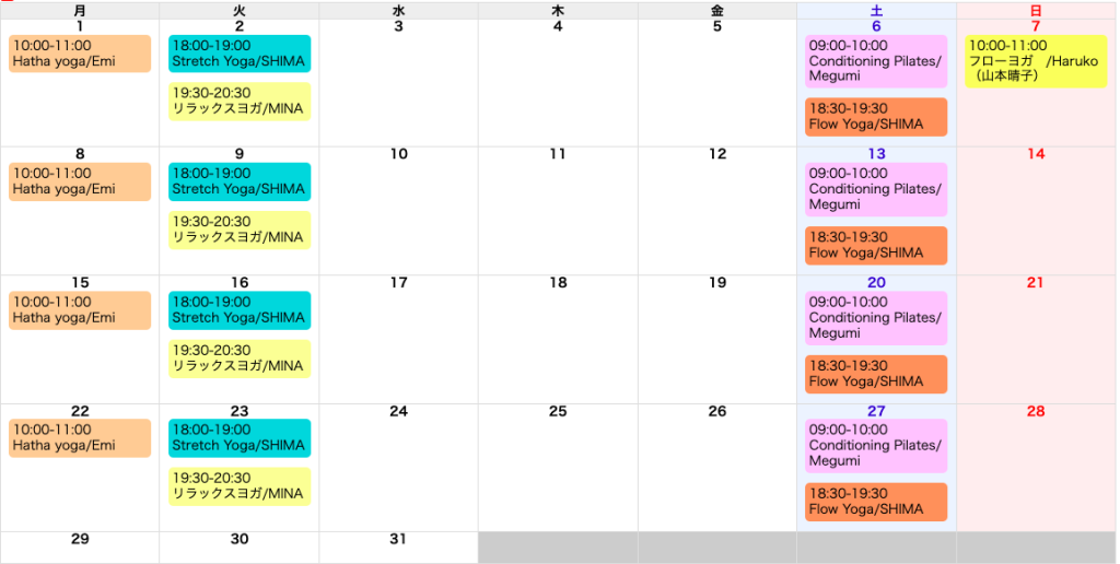 3. 12月ヨガ ピラティス レッスンスケジュール